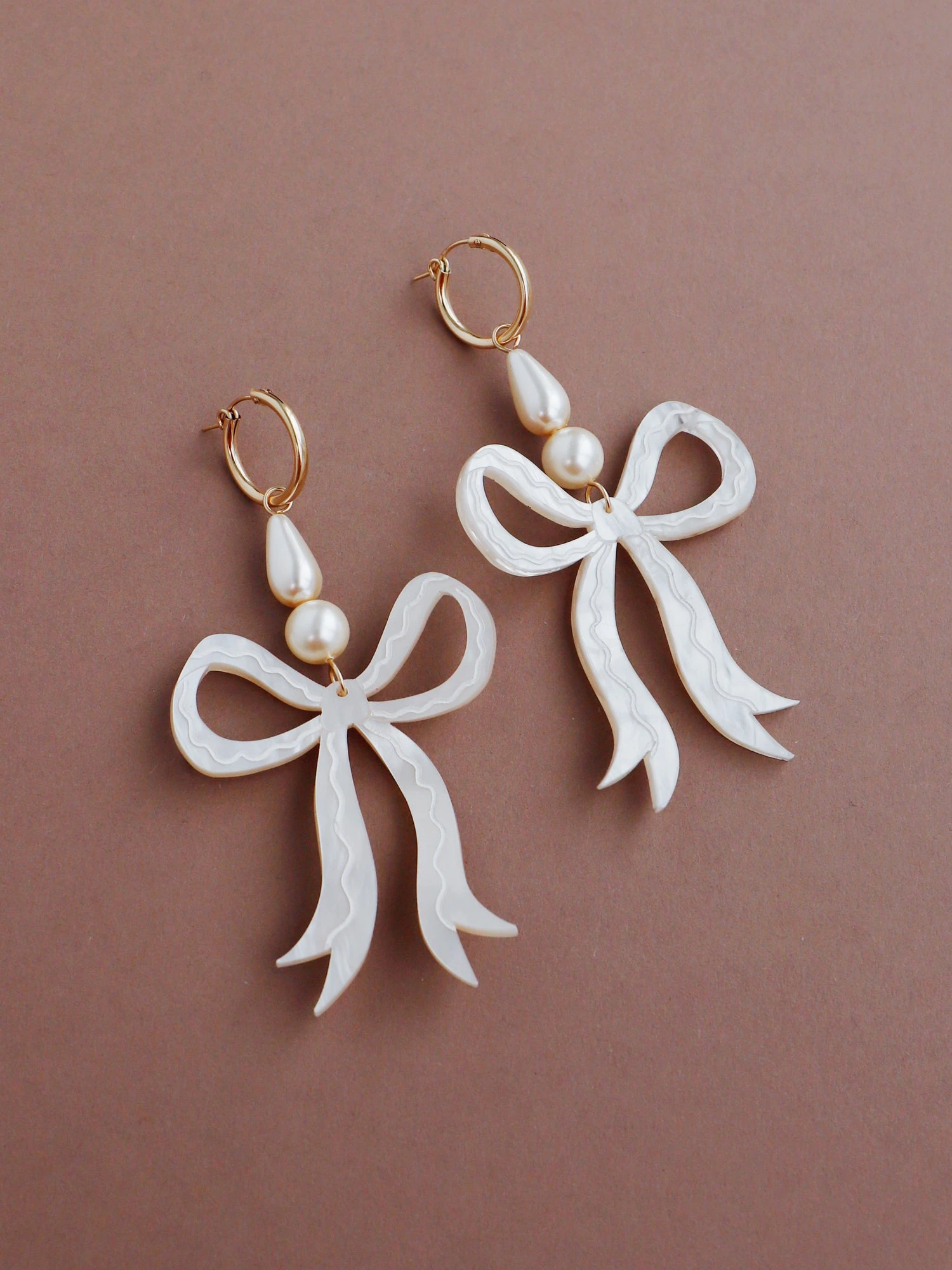 Romantic bow earrings made from velvety marbled acrylic with hand-inked details. Finished off with high quality glass pearls and 14k gold-filled findings. Surprisingly lightweight so can be worn for extended periods of time.