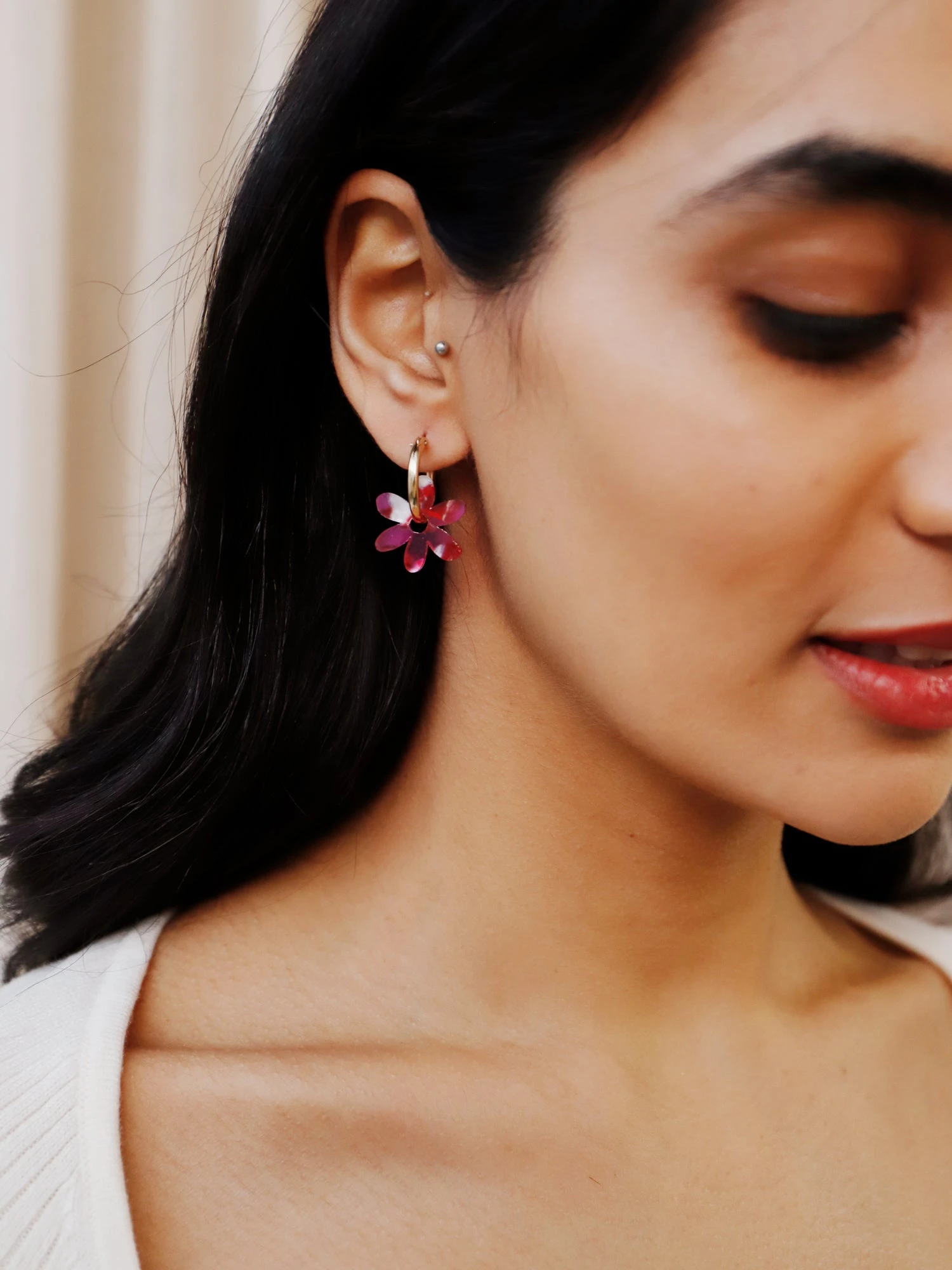 Small abstract flower charms made from 100% recycled acrylic.