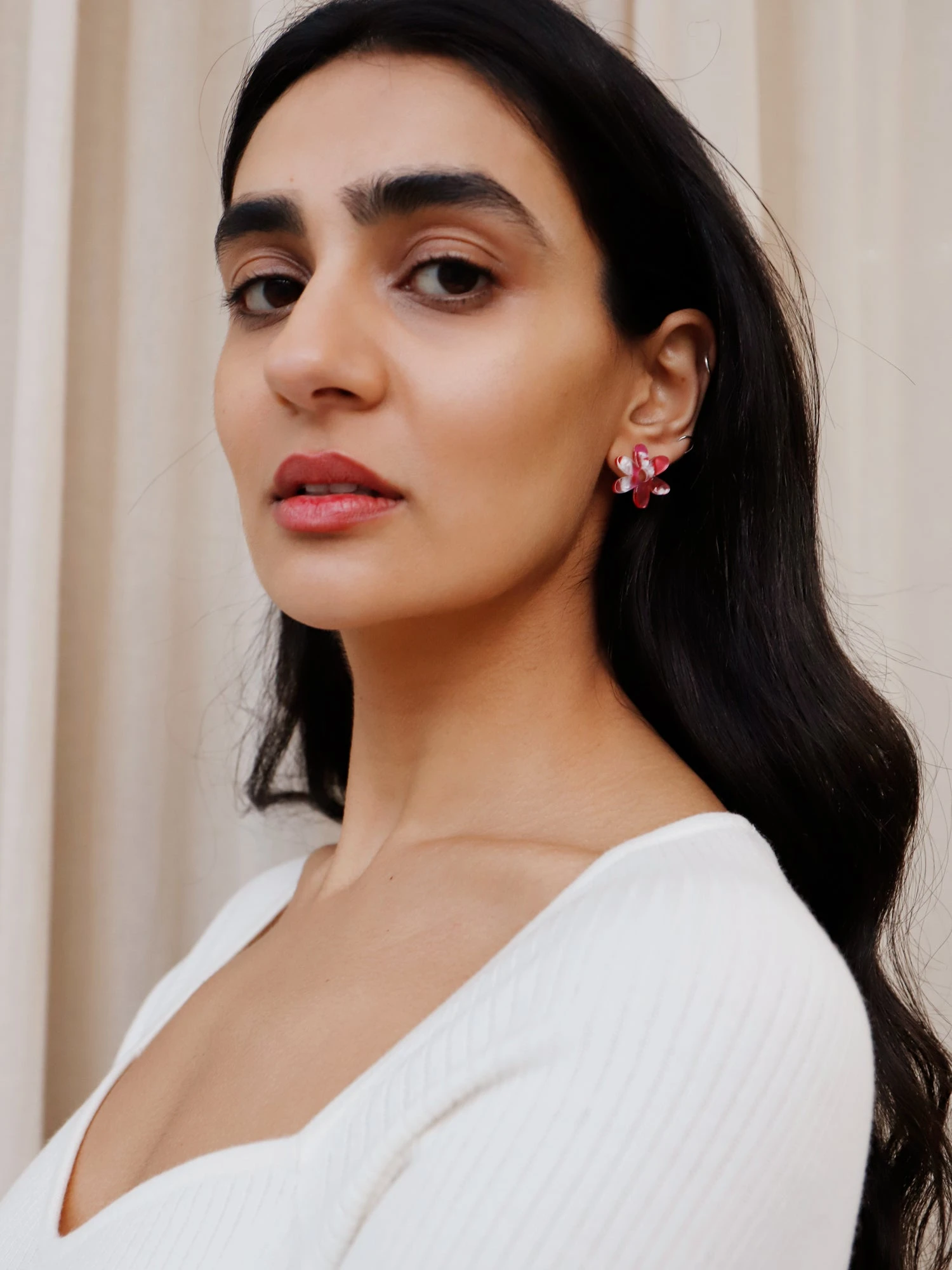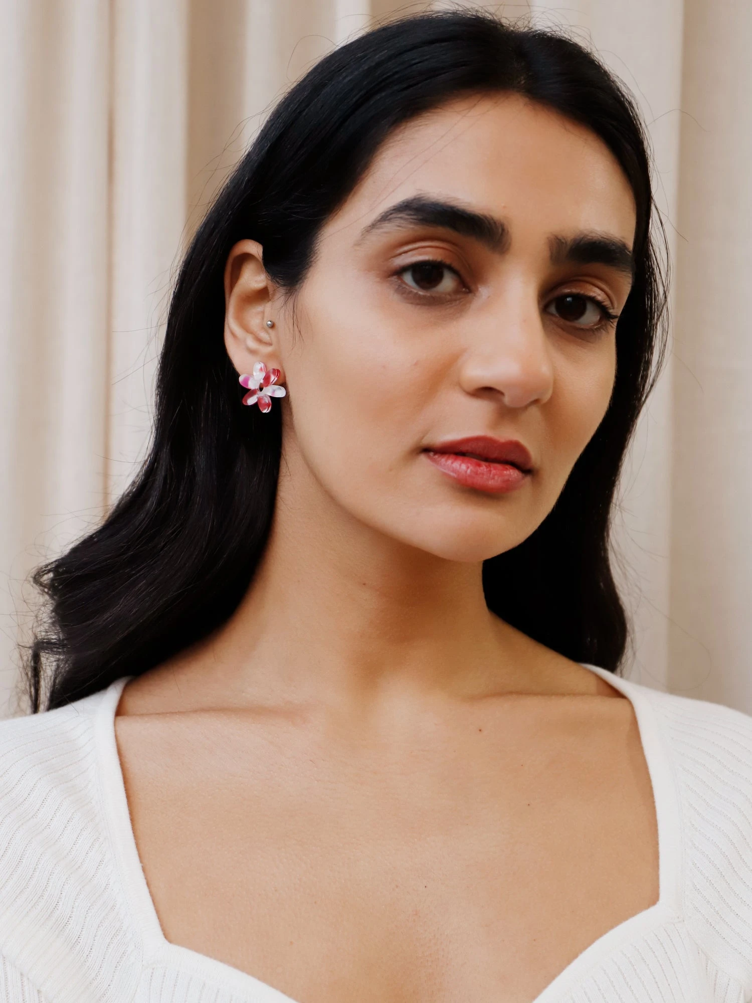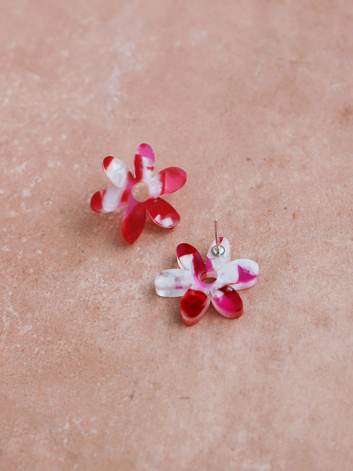 Small abstract flower studs made with 100% recycled acrylic and sterling silver earring posts & butterflies.