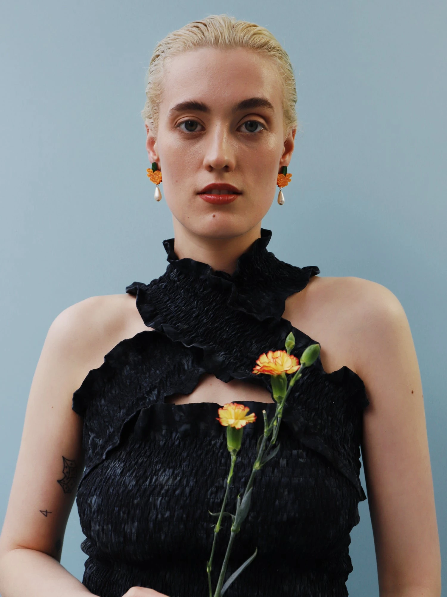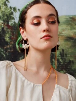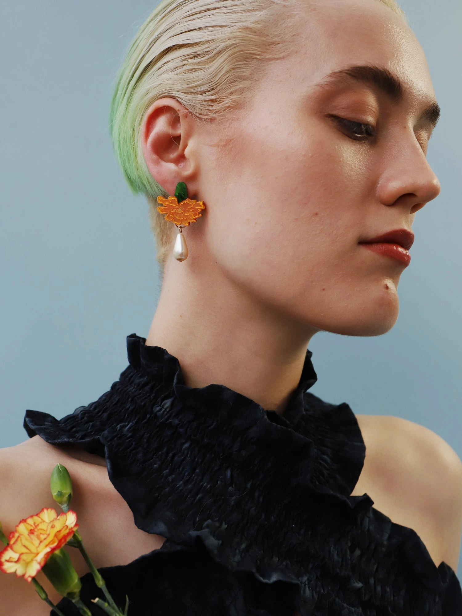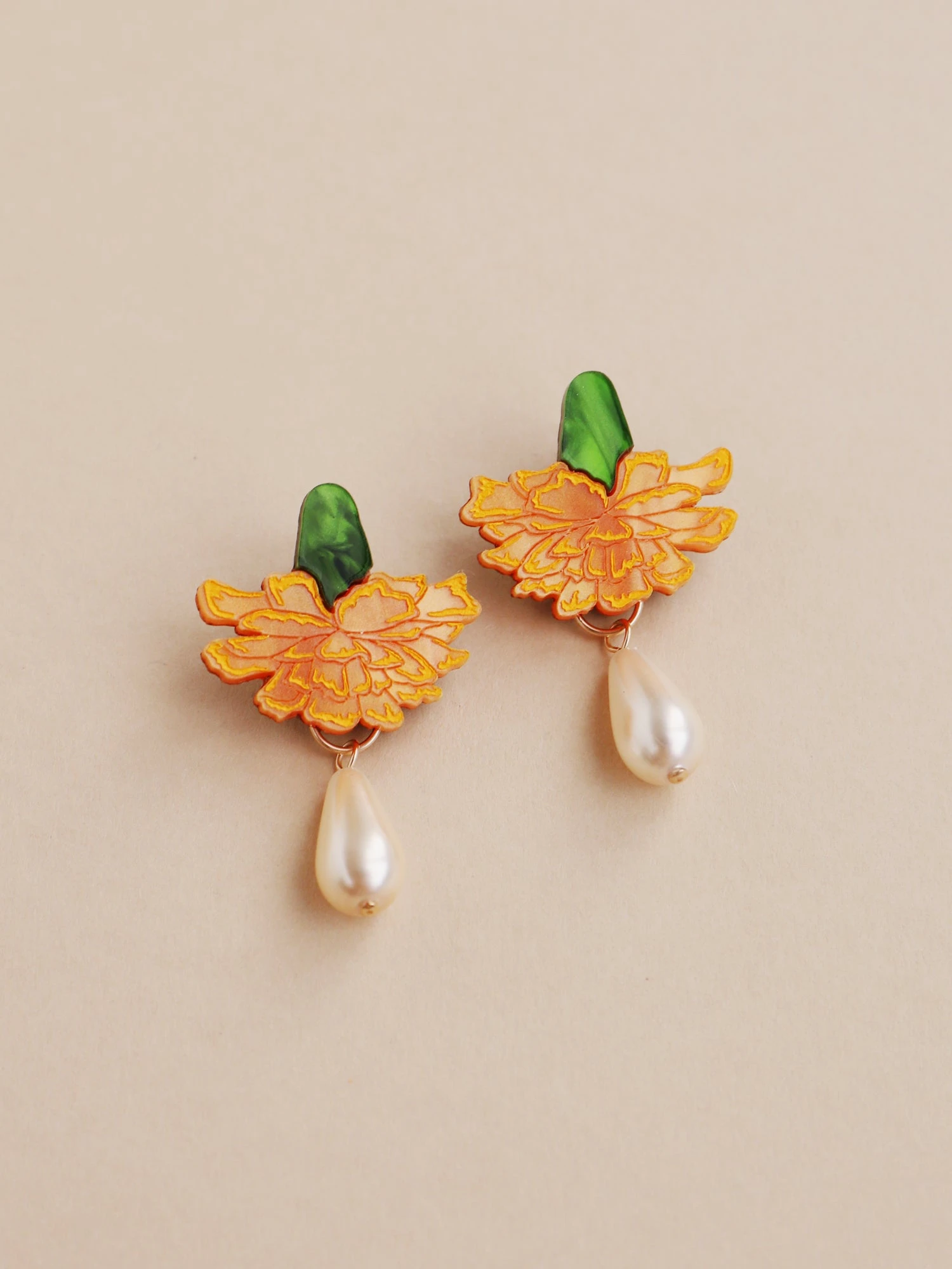 Inspired by sunnier days, our Calendula Drop Stud earrings are super lightweight, and are made from acrylic with glass pearl details and hand-inked engravings.Â