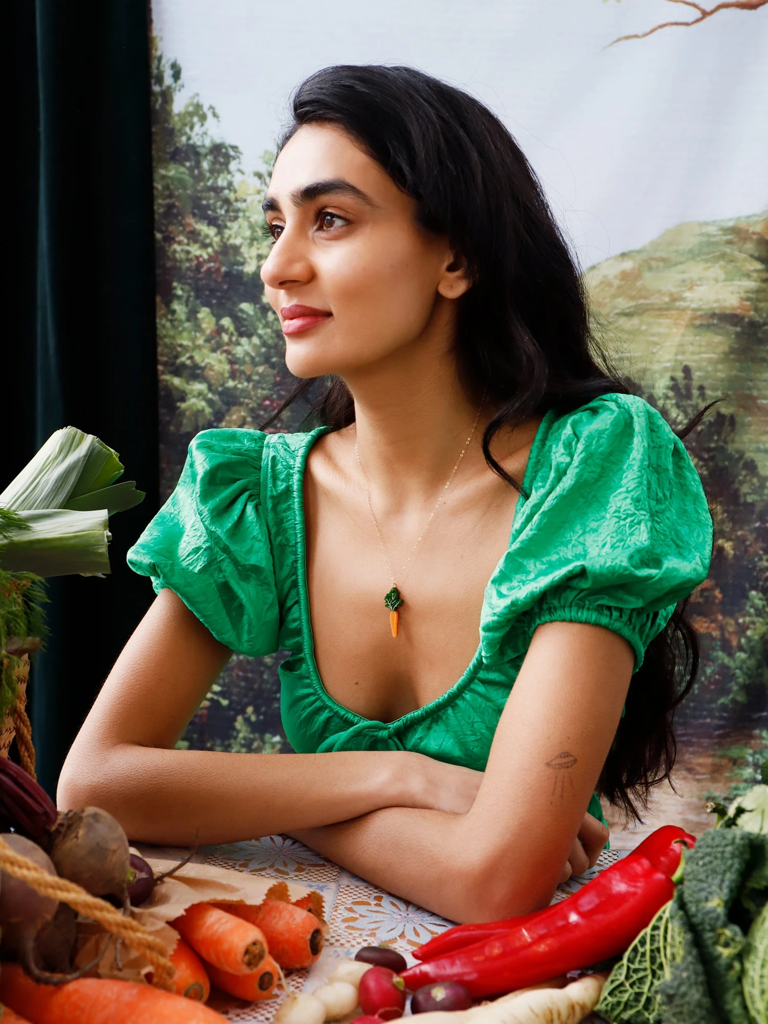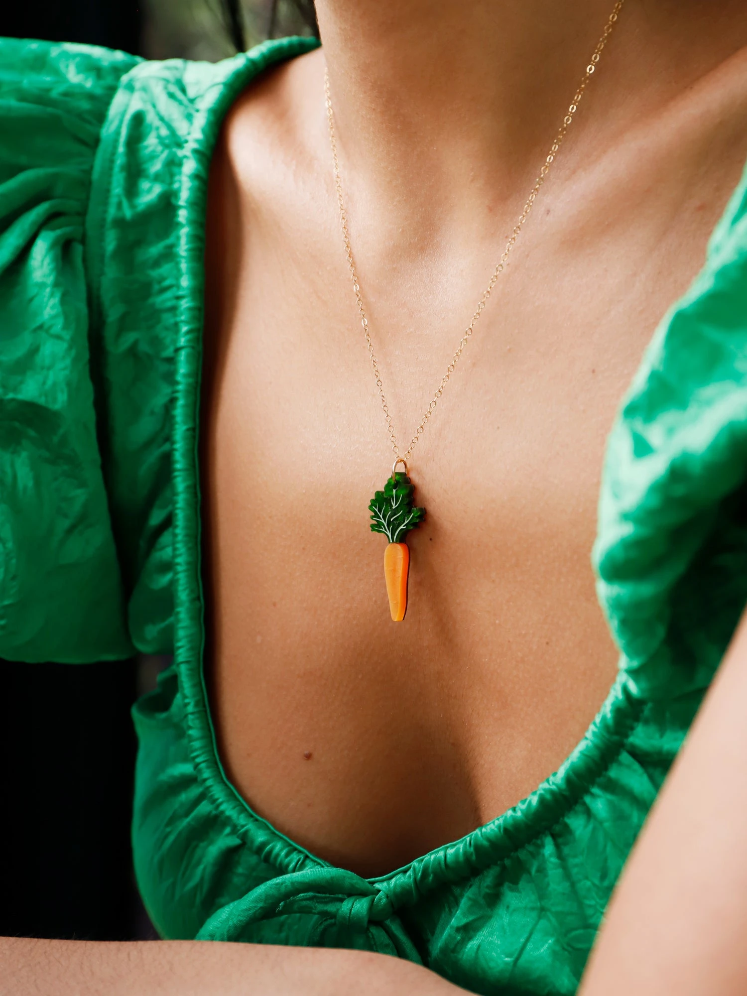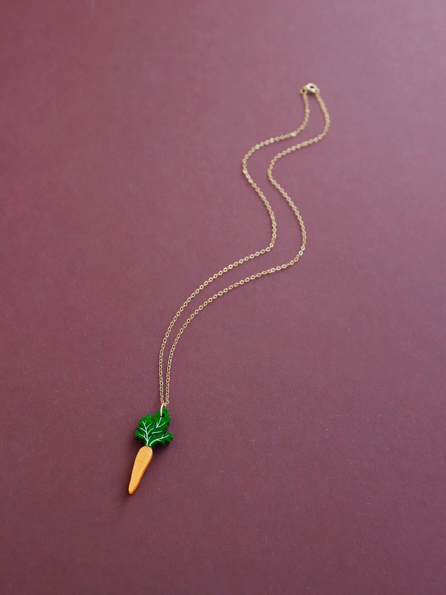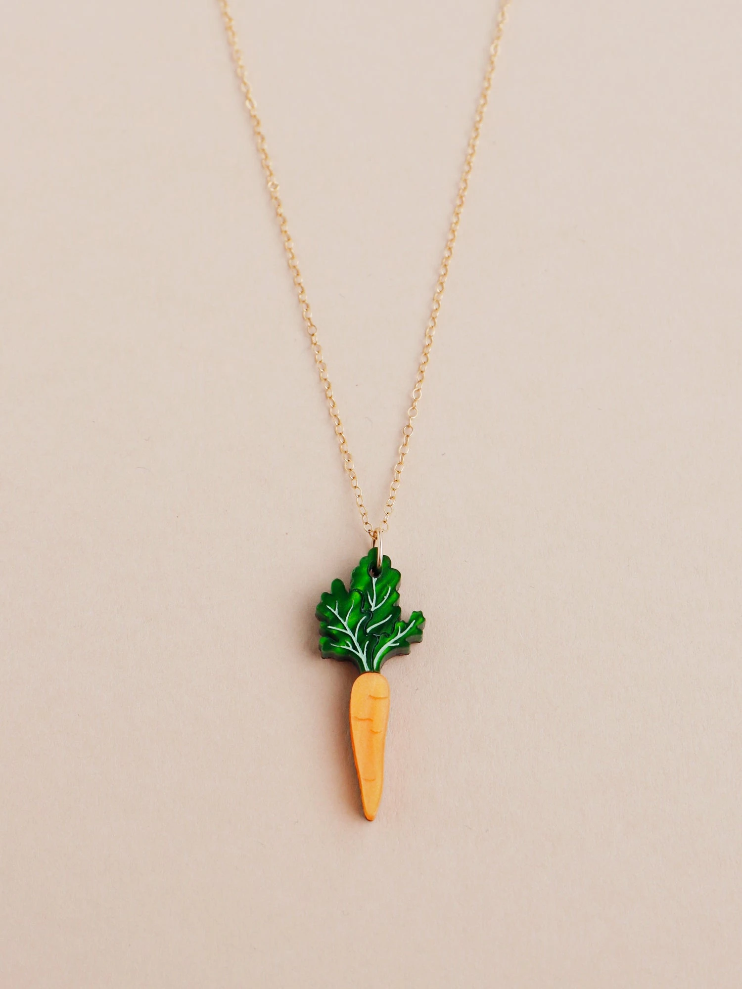 A playful carrot pendant made from marbled acrylic, wood and an optional 14k gold-filled chain.