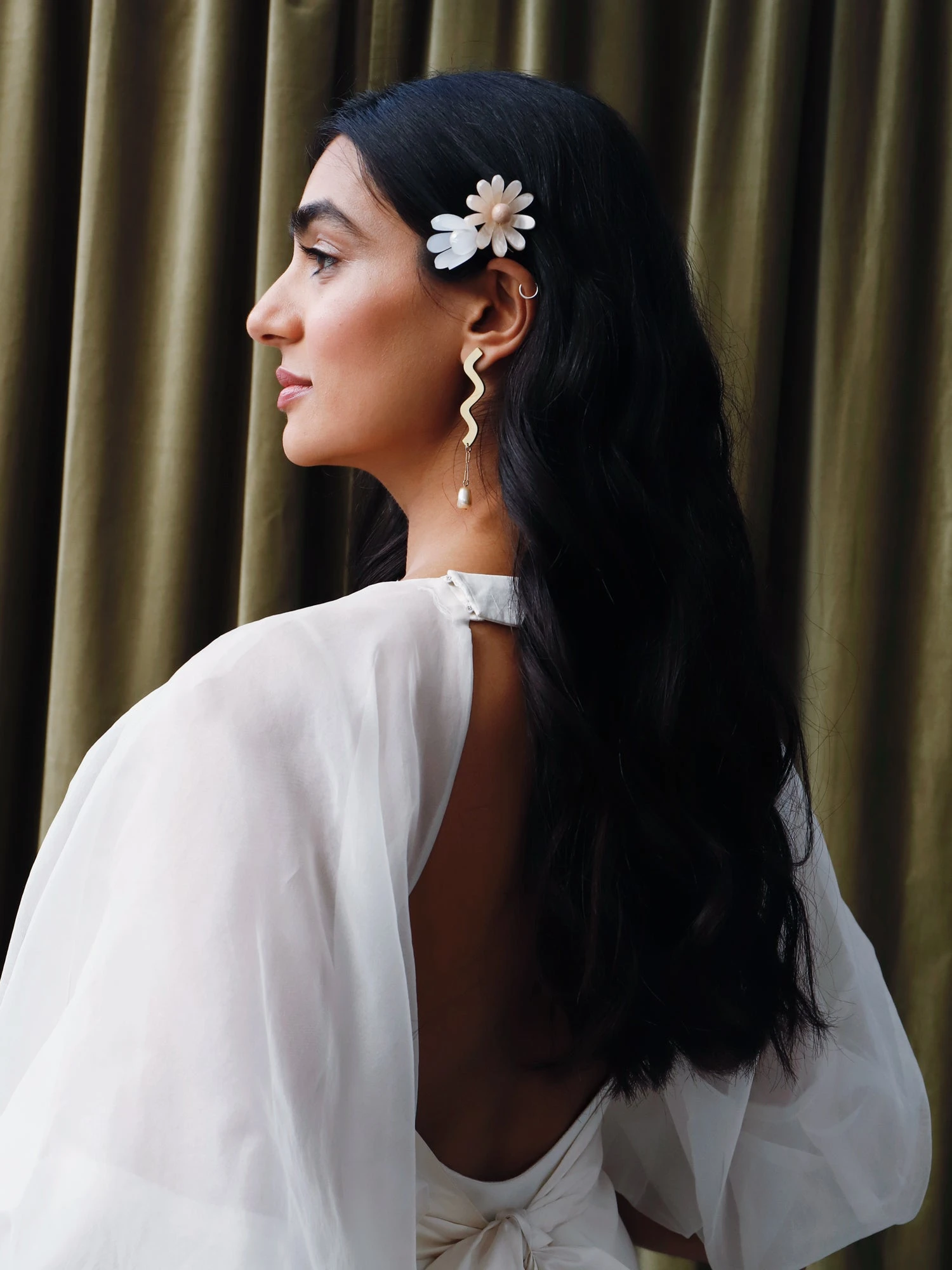 Each flower is made from hand-formed acrylic and is assembled onto a small wire  attached to the combs.  This wire allows you to move the flower around to a position that works best in your hairstyle – clever!