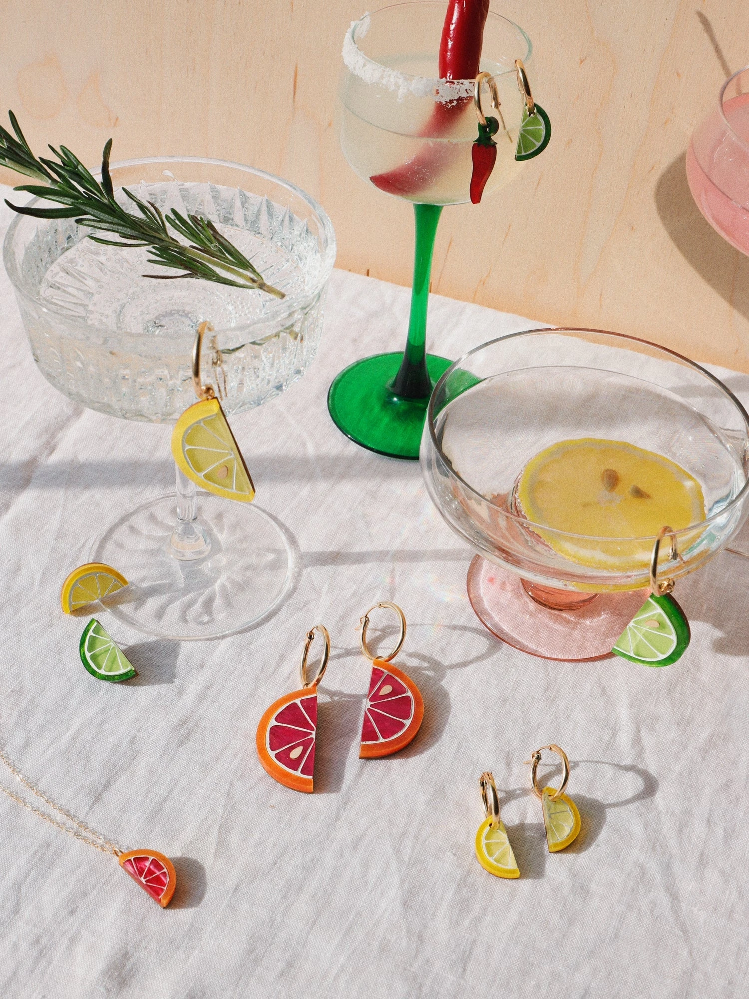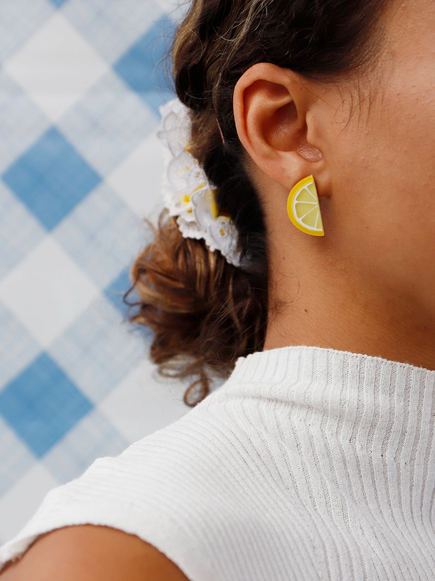 Garnish your outfit with a slice of lemon & lime! Our mini studs are made from acrylic, wood and sterling silver clip on clasps with hand-inked details.Â