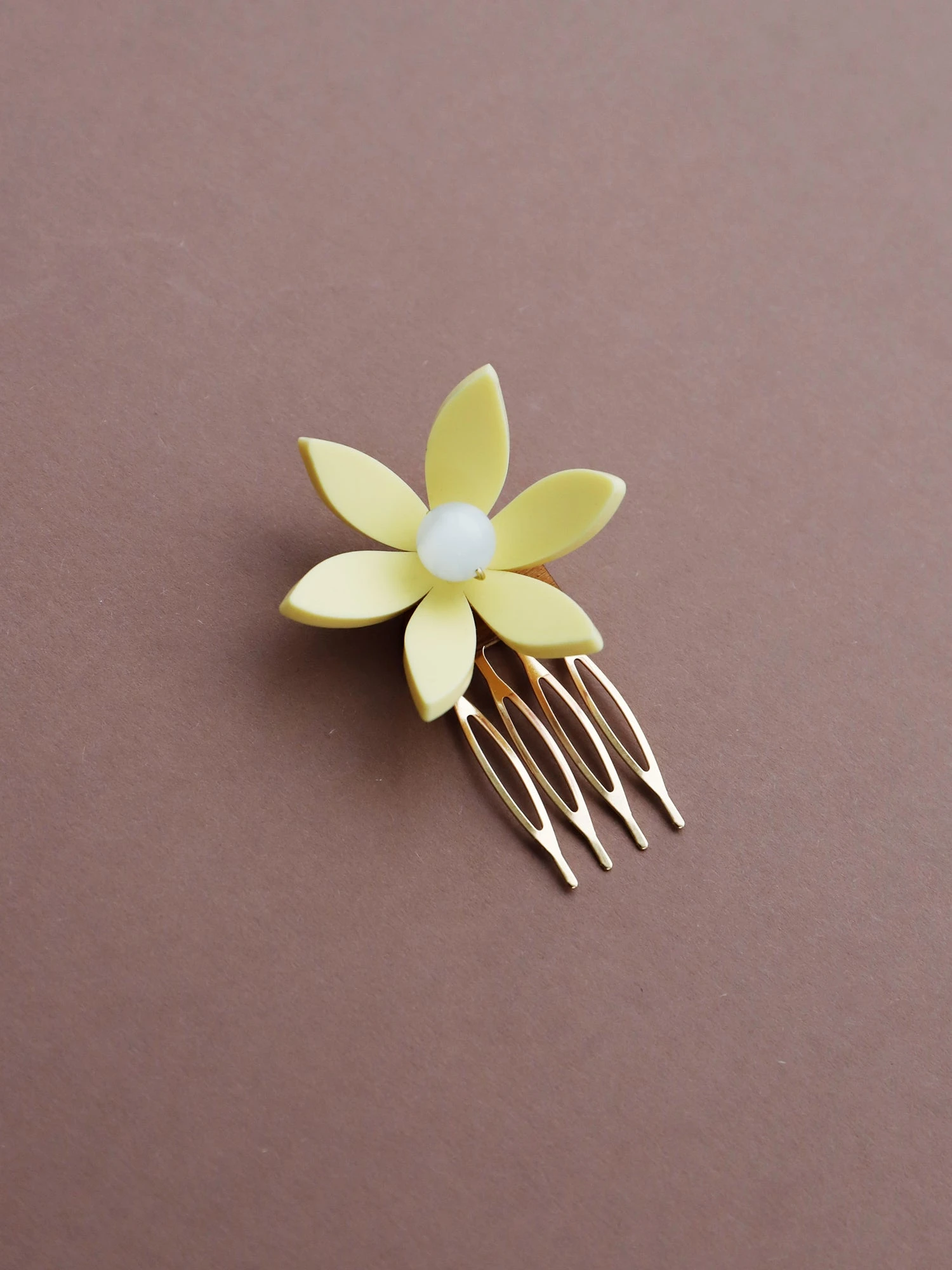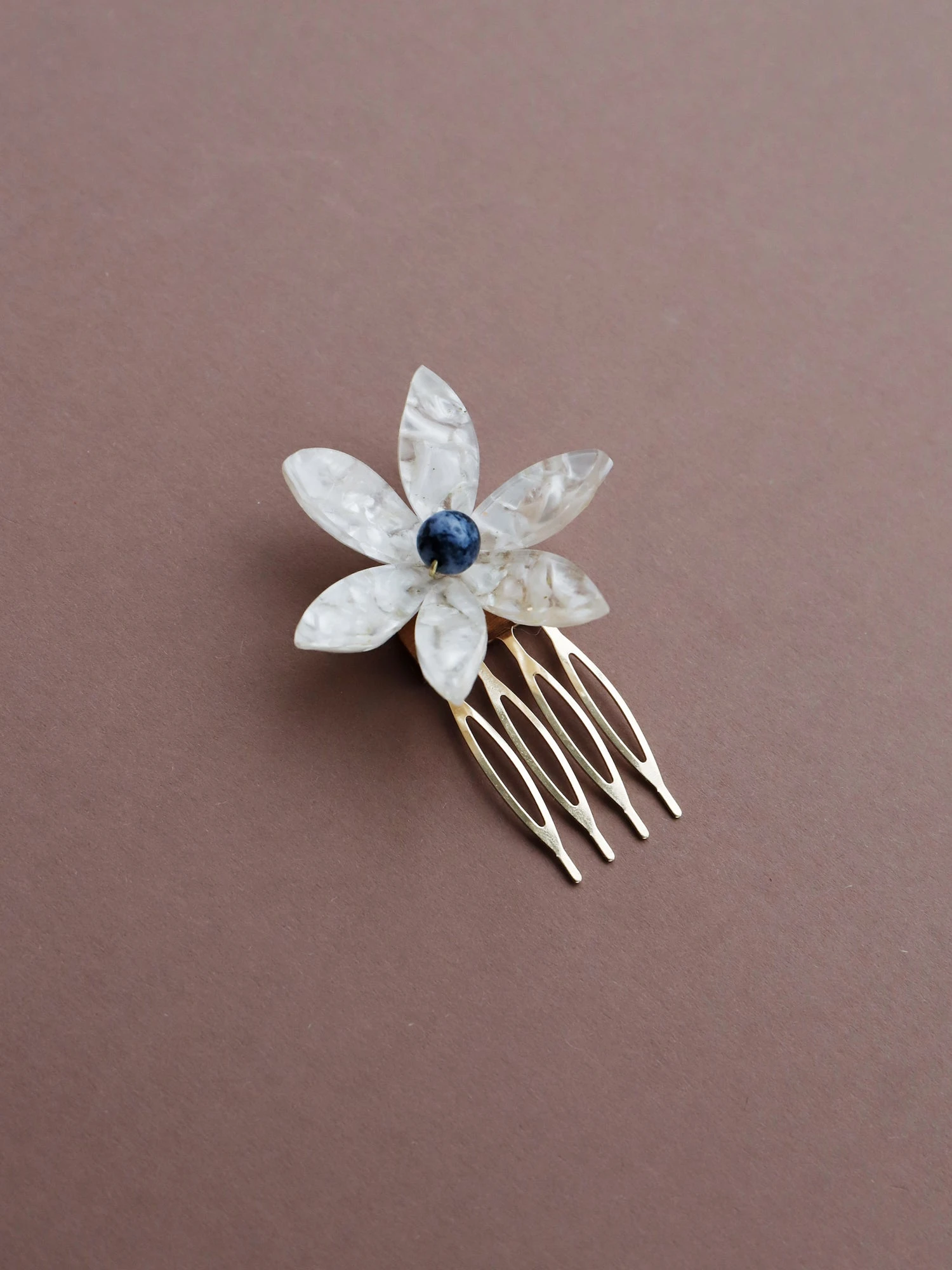 Each flower is made from hand-formed acrylic and is assembled onto a small wire attached to the combs. This wire allows you to move the flower around to a position that works best in your hairstyle – clever!