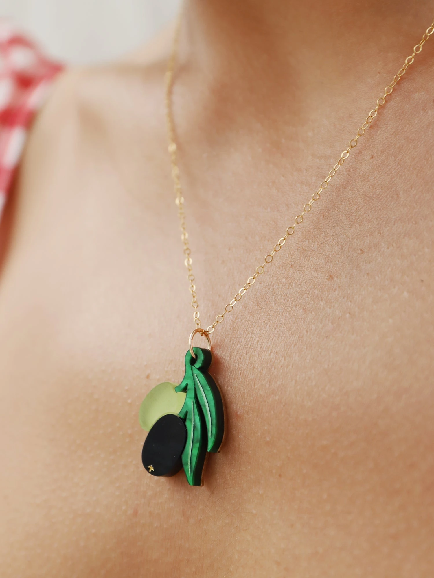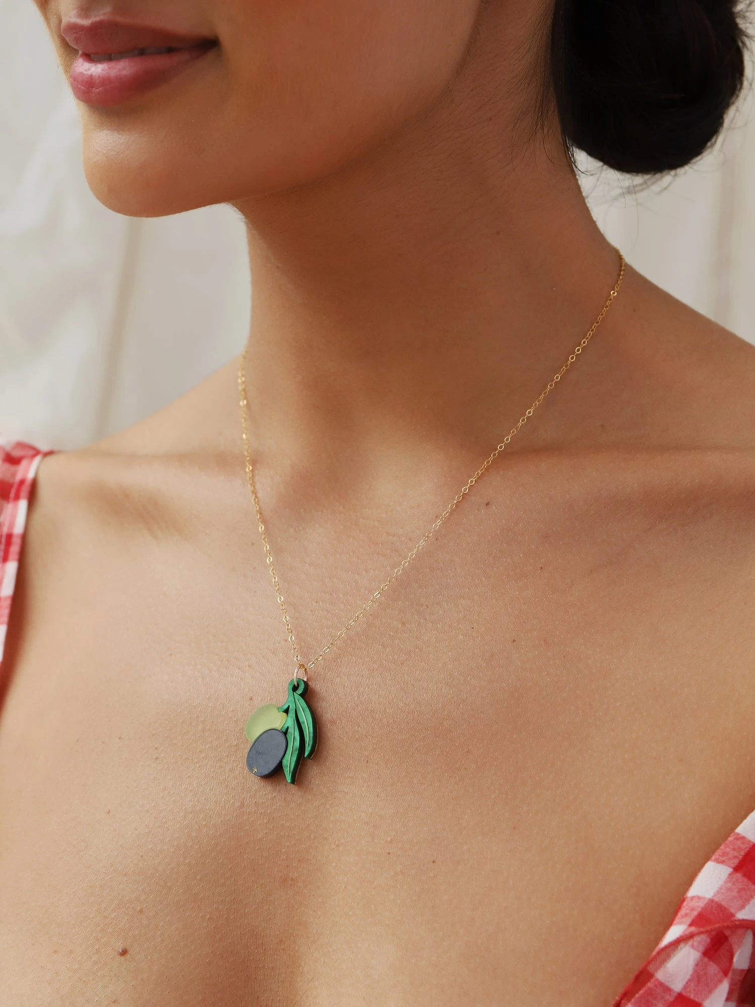 Plucked from the vineyard, our hand-crafted olive necklace is made with acrylic and hand-inked details.Â