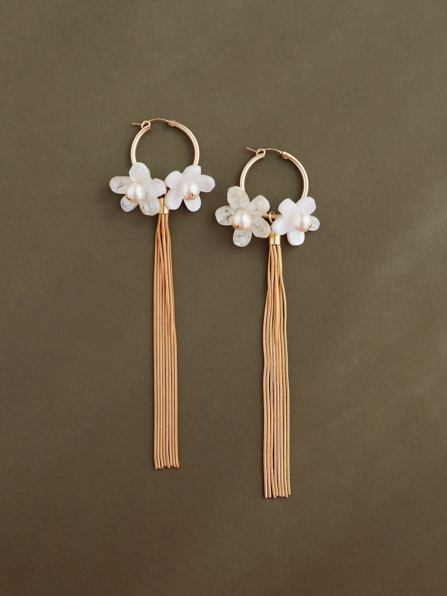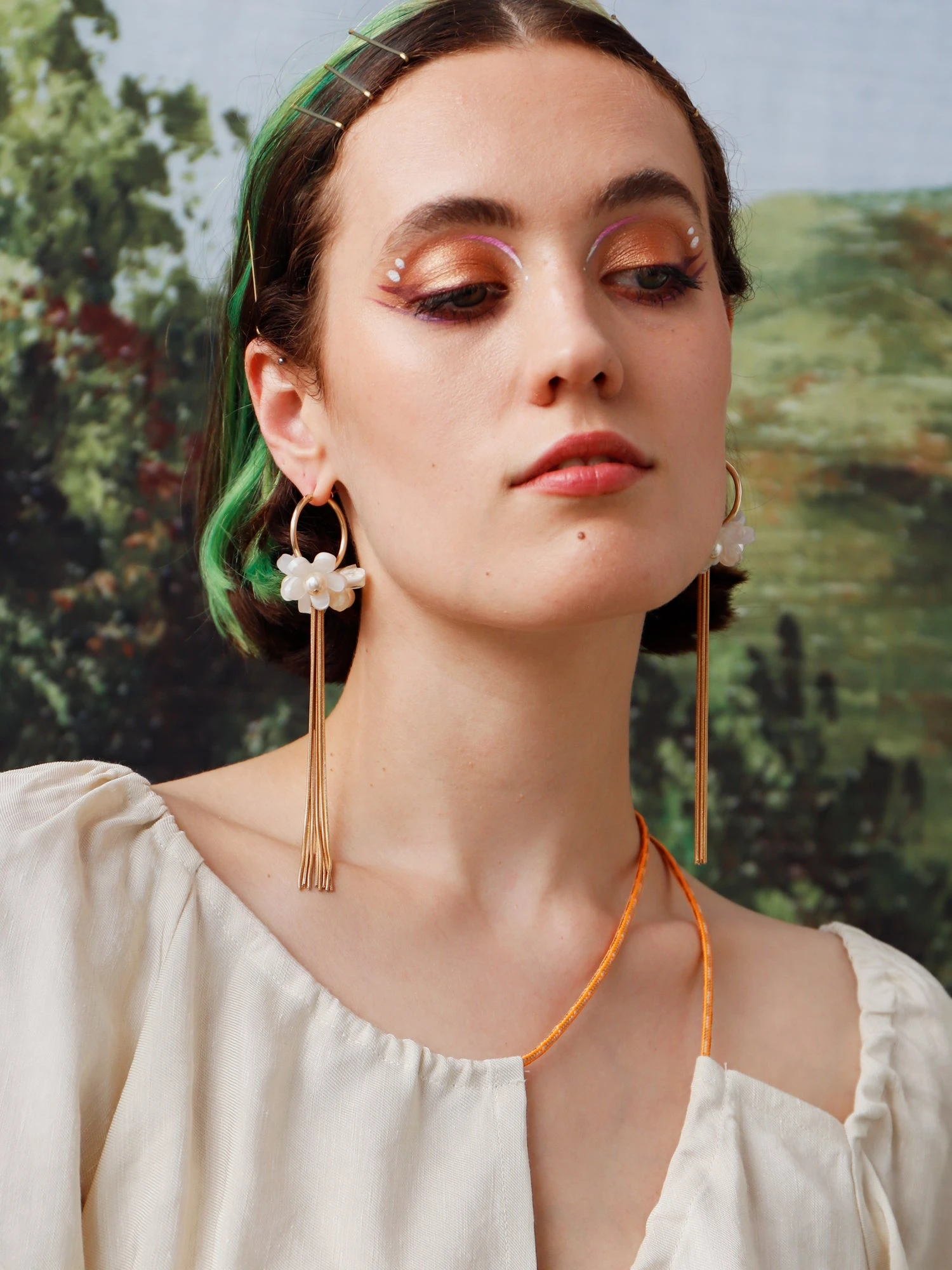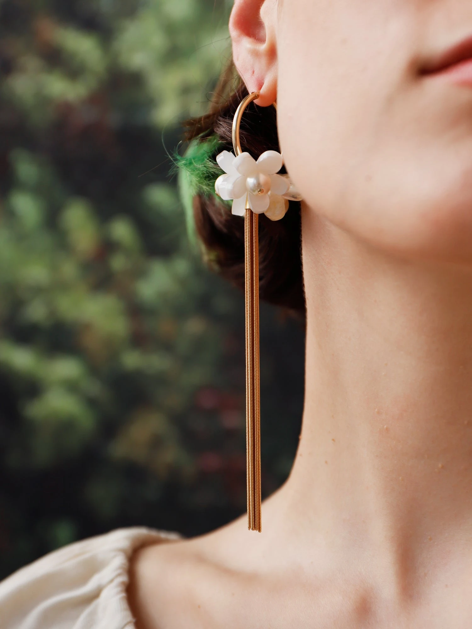 These elegant, sculptural, statement earrings come with 6 interchangeable flowers and 2 long tassel charms. The multi-textured white flowers are individually hand-sculpted and look great worn in different combinations with or without the tassels.