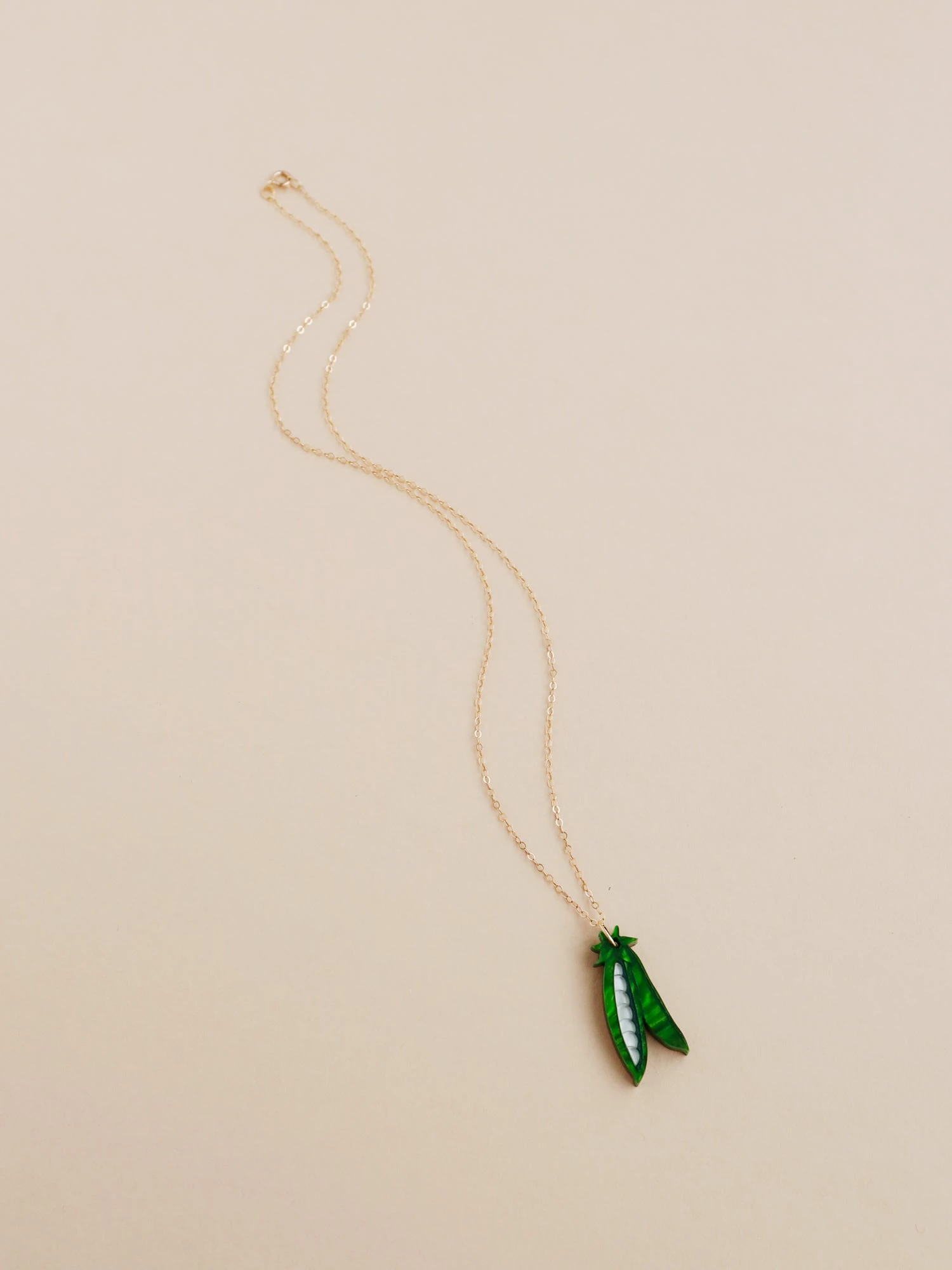 A playful peas pendant made from marbled acrylic and wood with an optional 14k gold-filled chain.Â