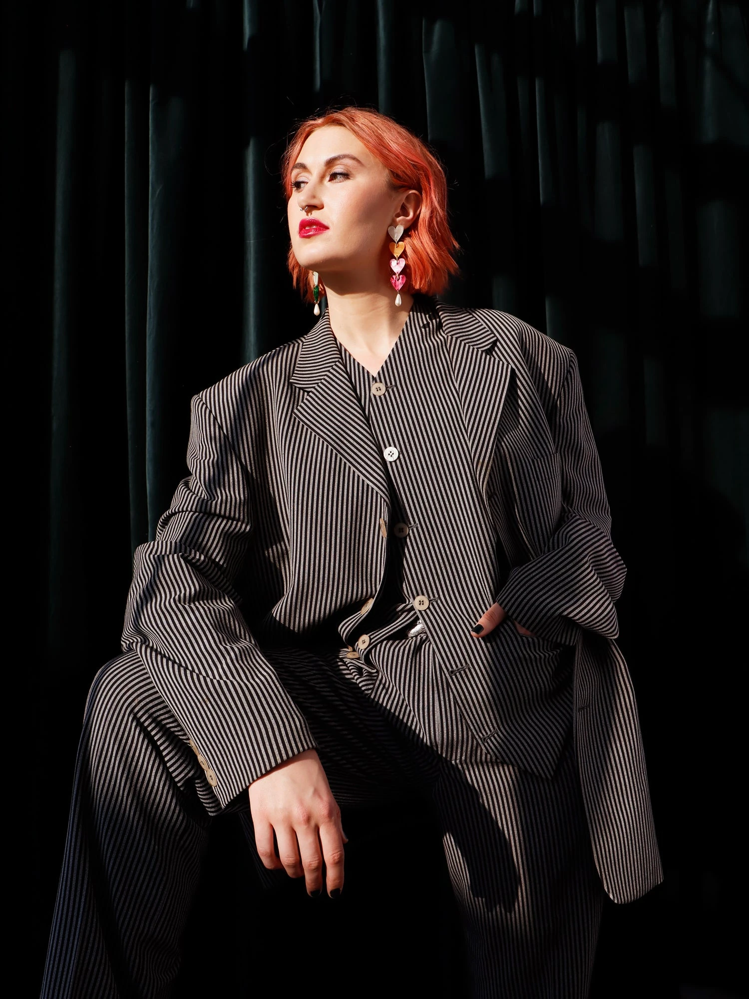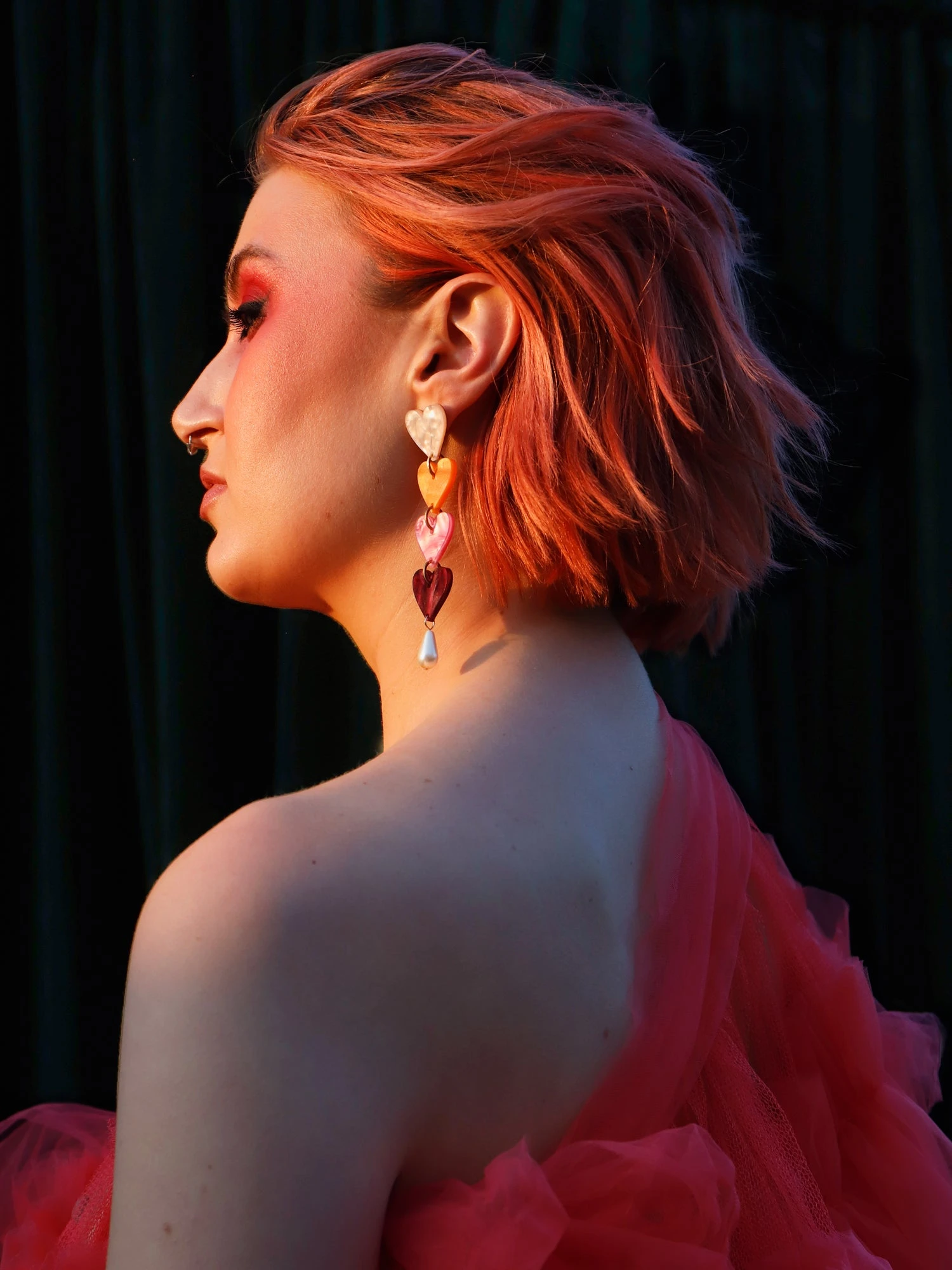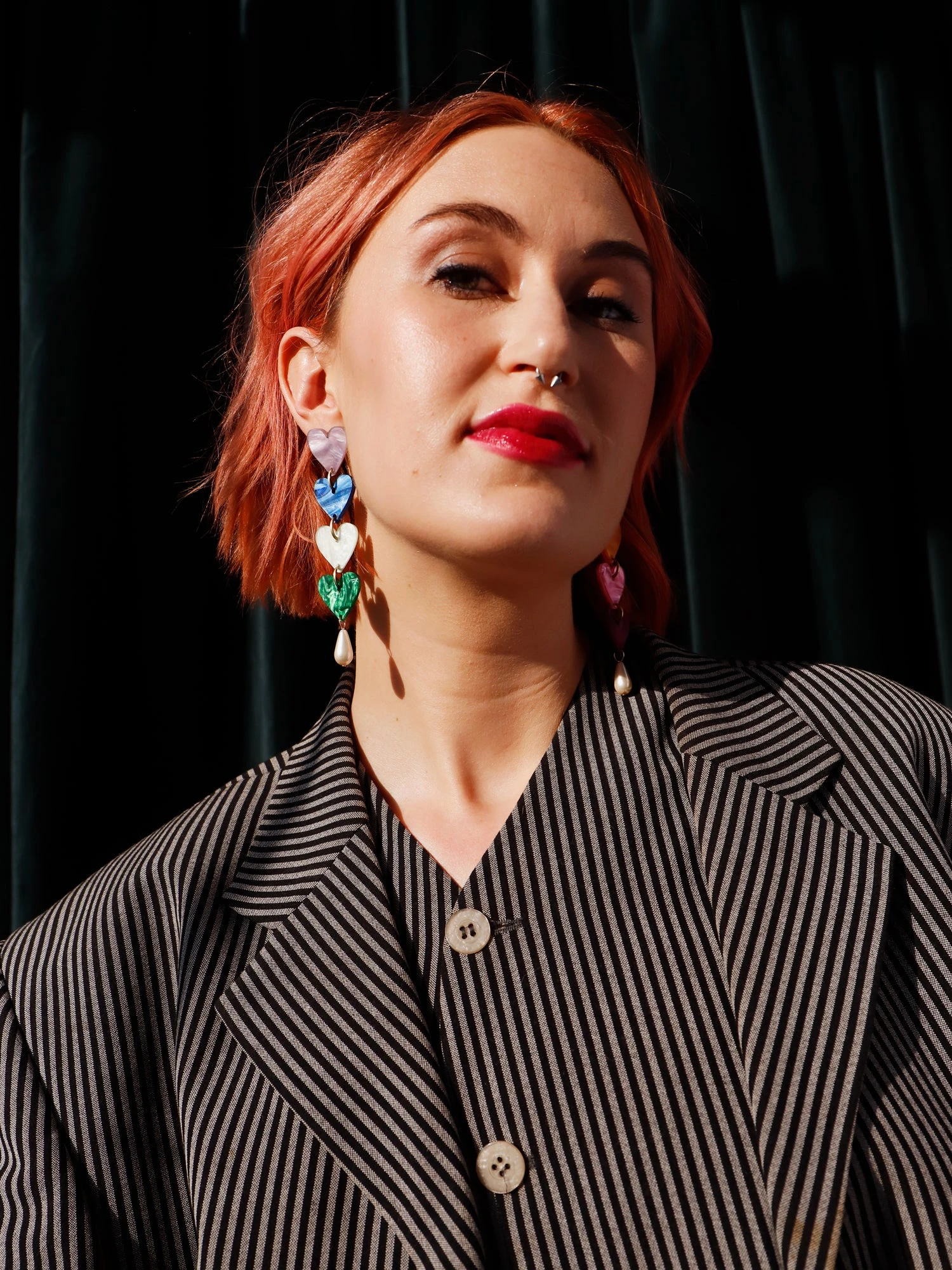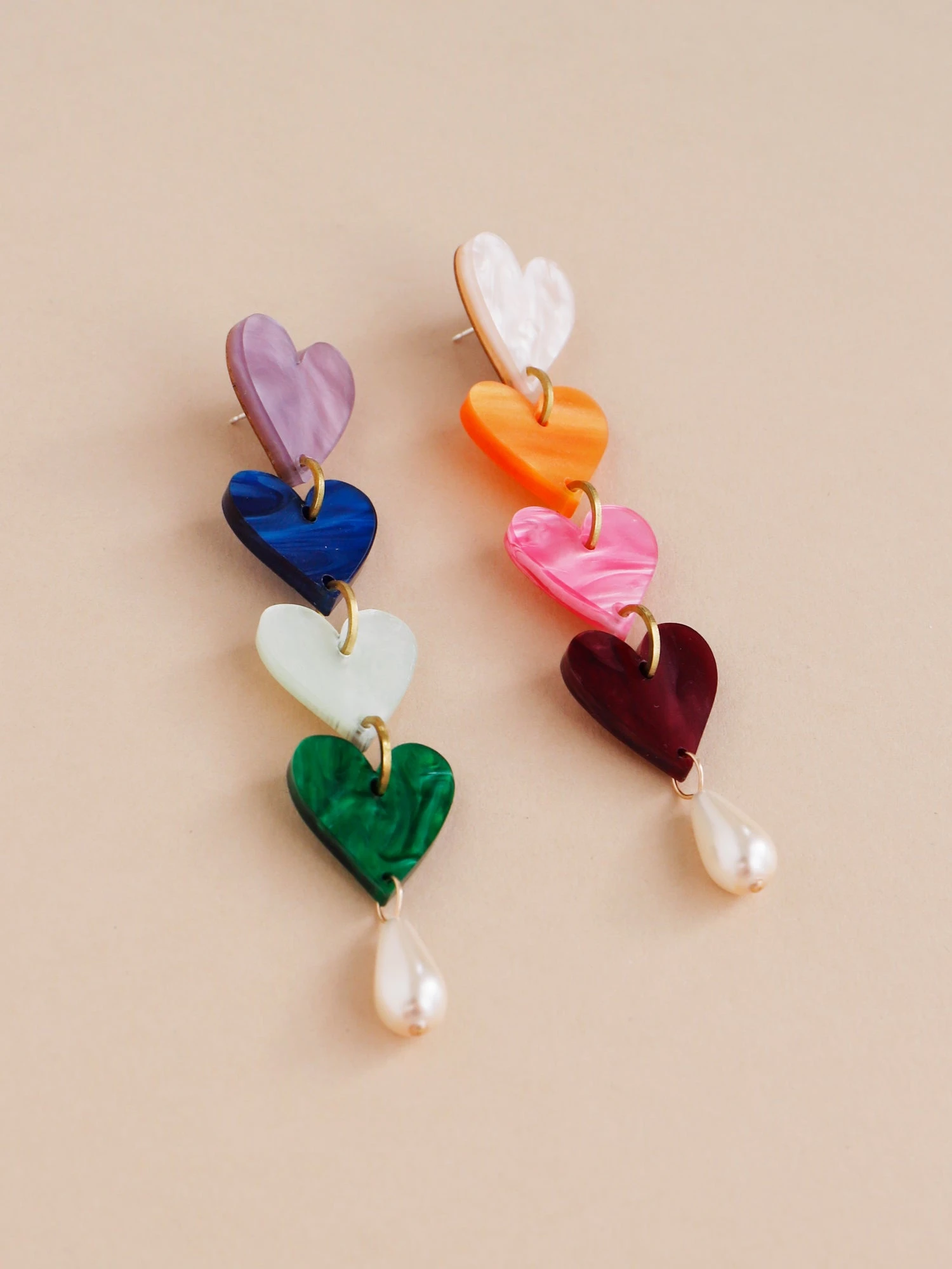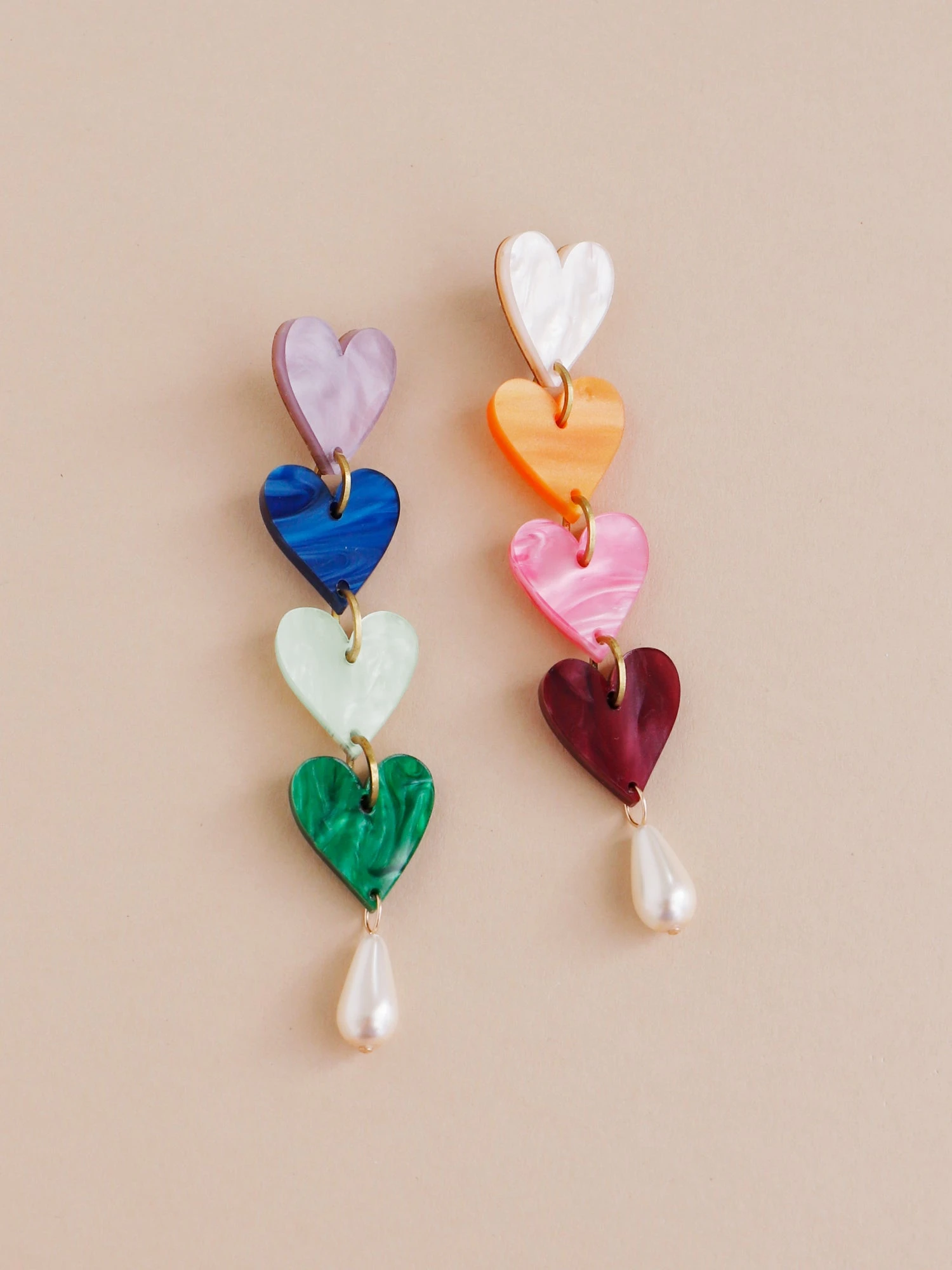 Statement earrings with rainbow coloured heart pendants, made from marble acrylic and glass pearl beads.