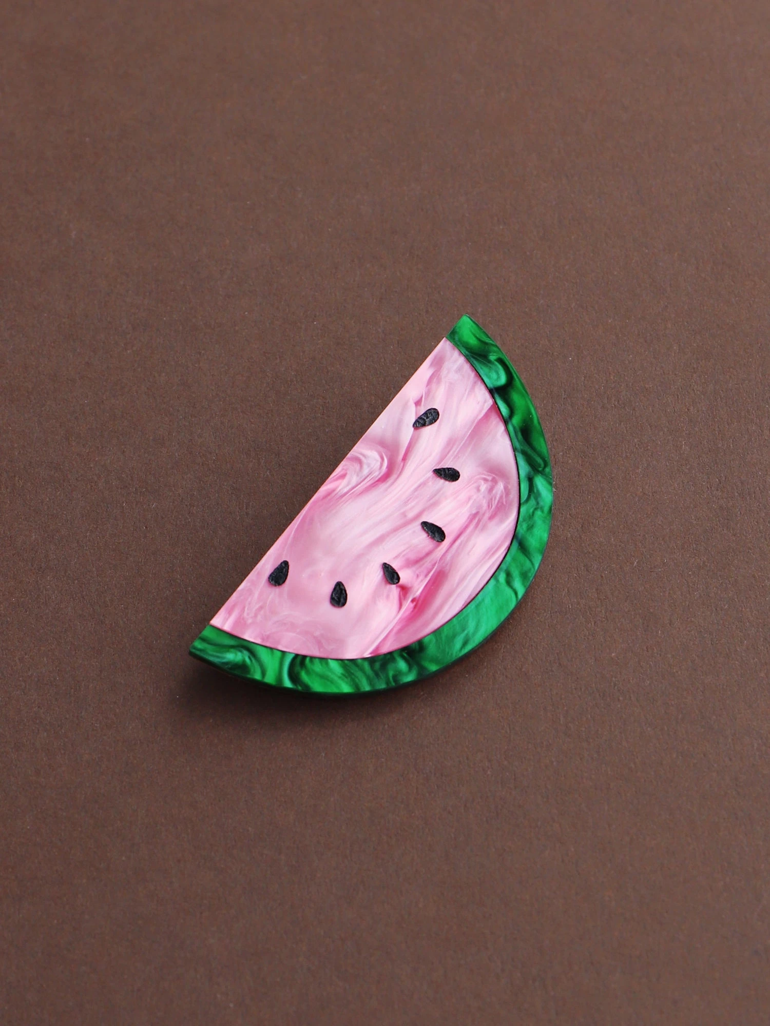 Our juicy watermelon hair-clip is made from acrylic with hand-inked details.